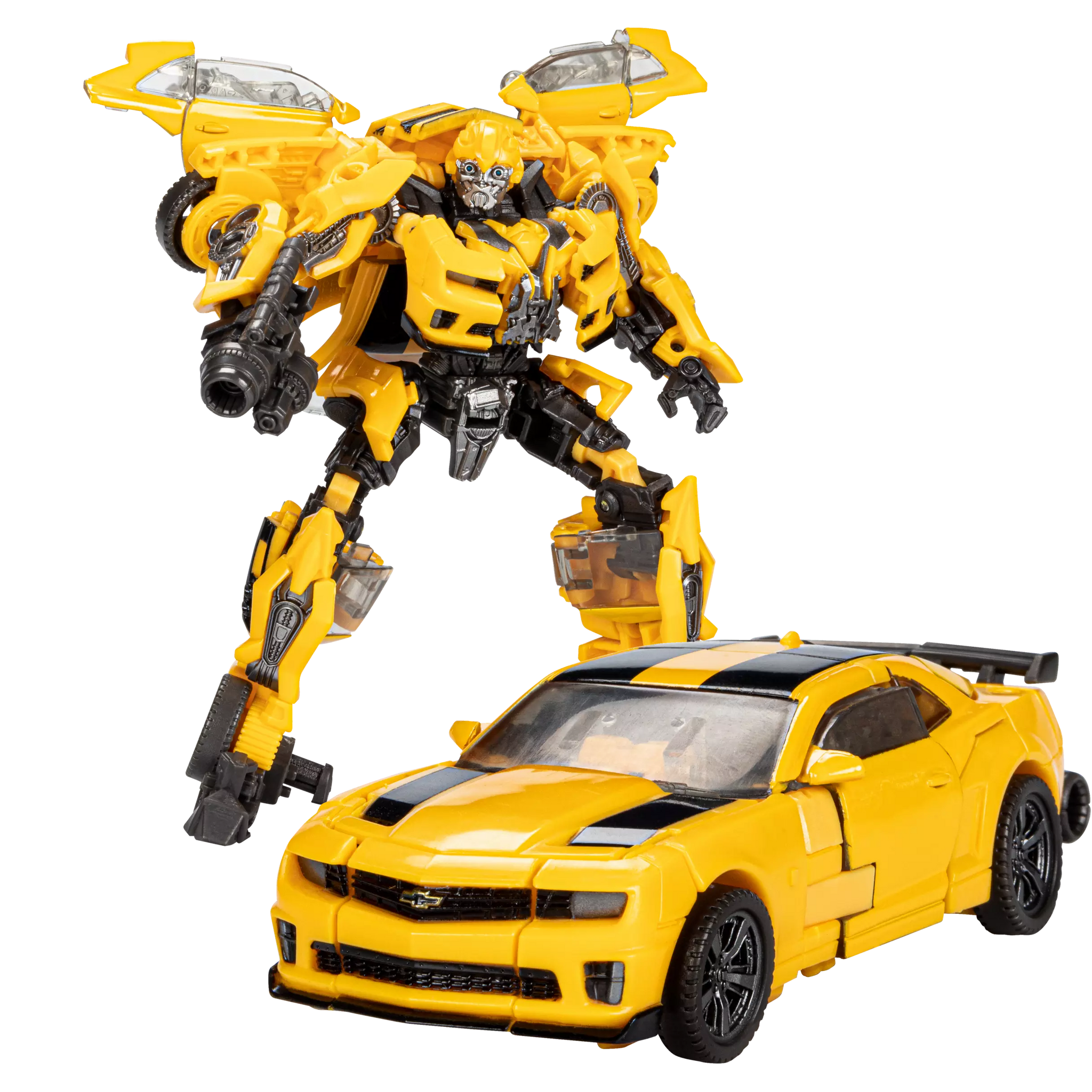 BUMBLEBEE A ESCALA DE 11,4 cm: La figura presenta una decoración vívida inspirada en la película, está altamente articulada para posarse e incluye un bláster inspirado en la película.